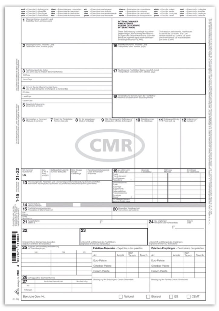 Kostenlose CMR Frachtbrief Vorlage: Effiziente Dokumentenerstellung mit allen relevanten Informationen wie Frachtbriefnummer, Kennzeichen, Packstückanzahl, Verpackungsart und detaillierte Güterbeschreibung. Ideal für reibungslose Transportprozesse.