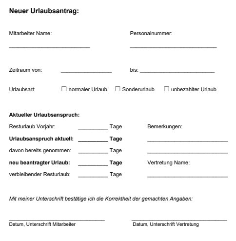 Laden Sie unsere kostenlose PDF-Vorlage für Ihren Urlaubsantrag herunter. Einfach ausfüllen, unterschreiben und einreichen. Perfekt für eine reibungslose und formgerechte Urlaubsplanung.