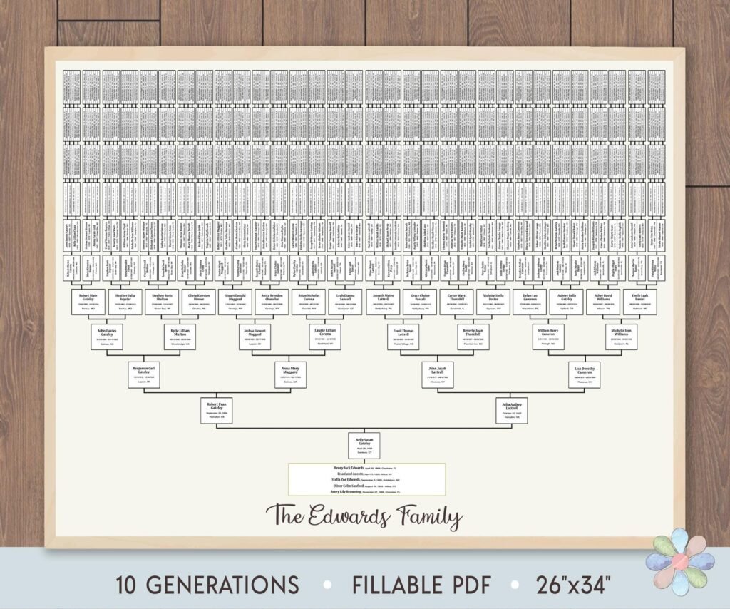 Laden Sie unsere 10-Generationen-Stammbaumvorlage herunter. Perfekt geeignet für Formate von A4 bis A0, um Ihre Familiengeschichte stilvoll und detailliert darzustellen. Ideal für Genealogie-Enthusiasten.