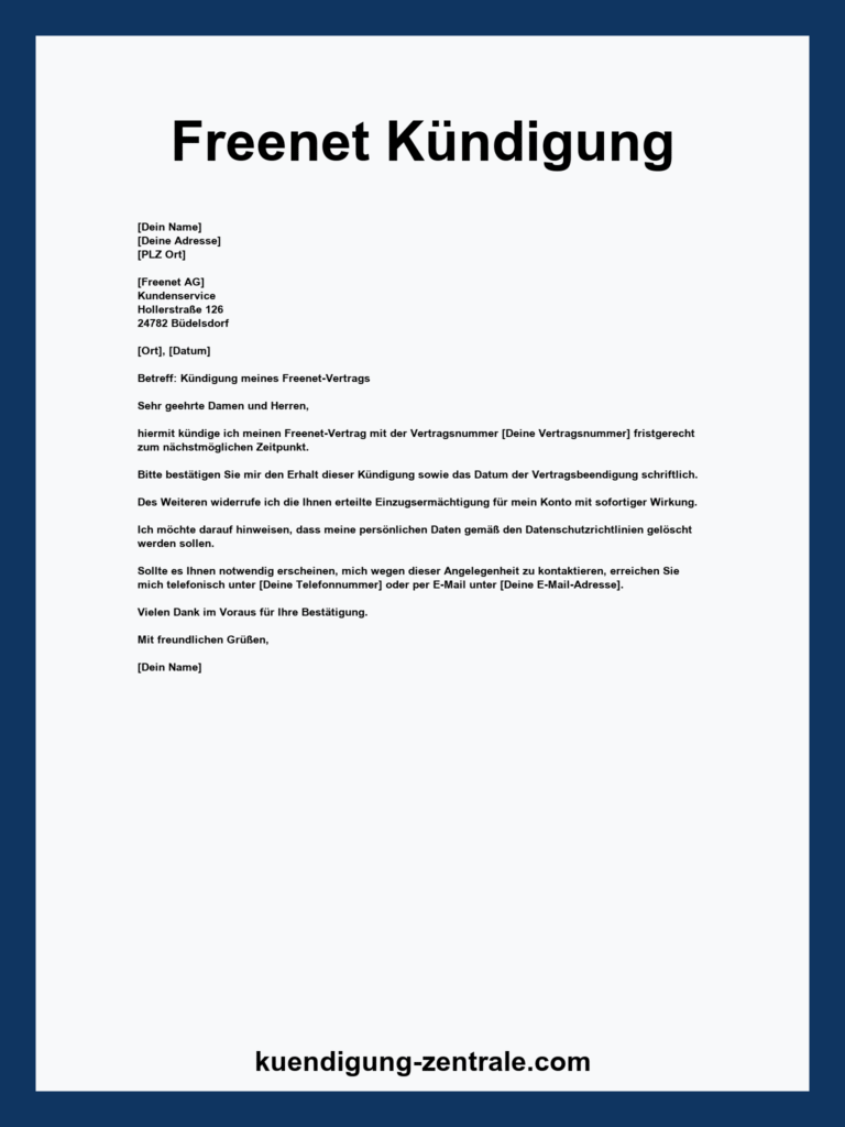 Kostenlose Vorlage zur Kündigung Ihres Mobilfunkvertrags. Einfach, schnell und rechtssicher Ihre Mobilfunknummer eintragen und Kündigung abschicken. Laden Sie jetzt unsere Freenet Kündigungsvorlage herunter!
